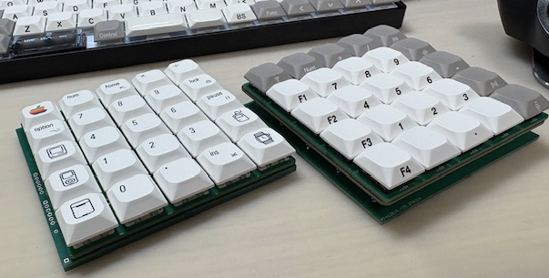 届いた5枚の基板のうち2枚を使って組み立てたキーボードが2台できあがり、左手用と右手用のキーキャップを装着して役割に対応する設定(キーマップ)を書き込みます。