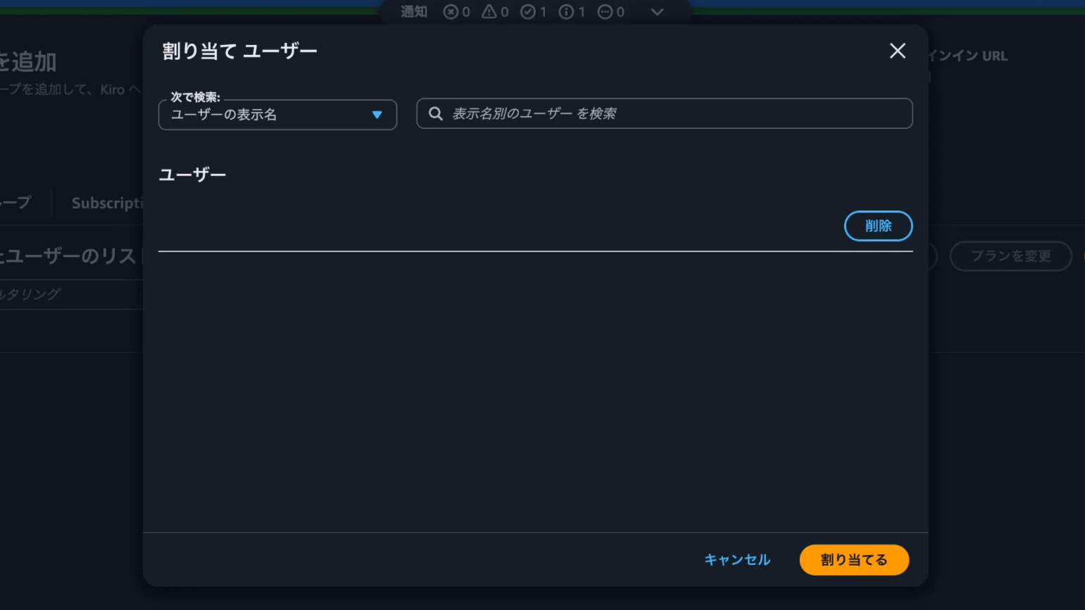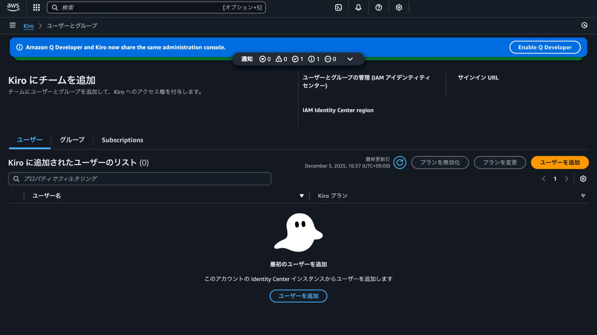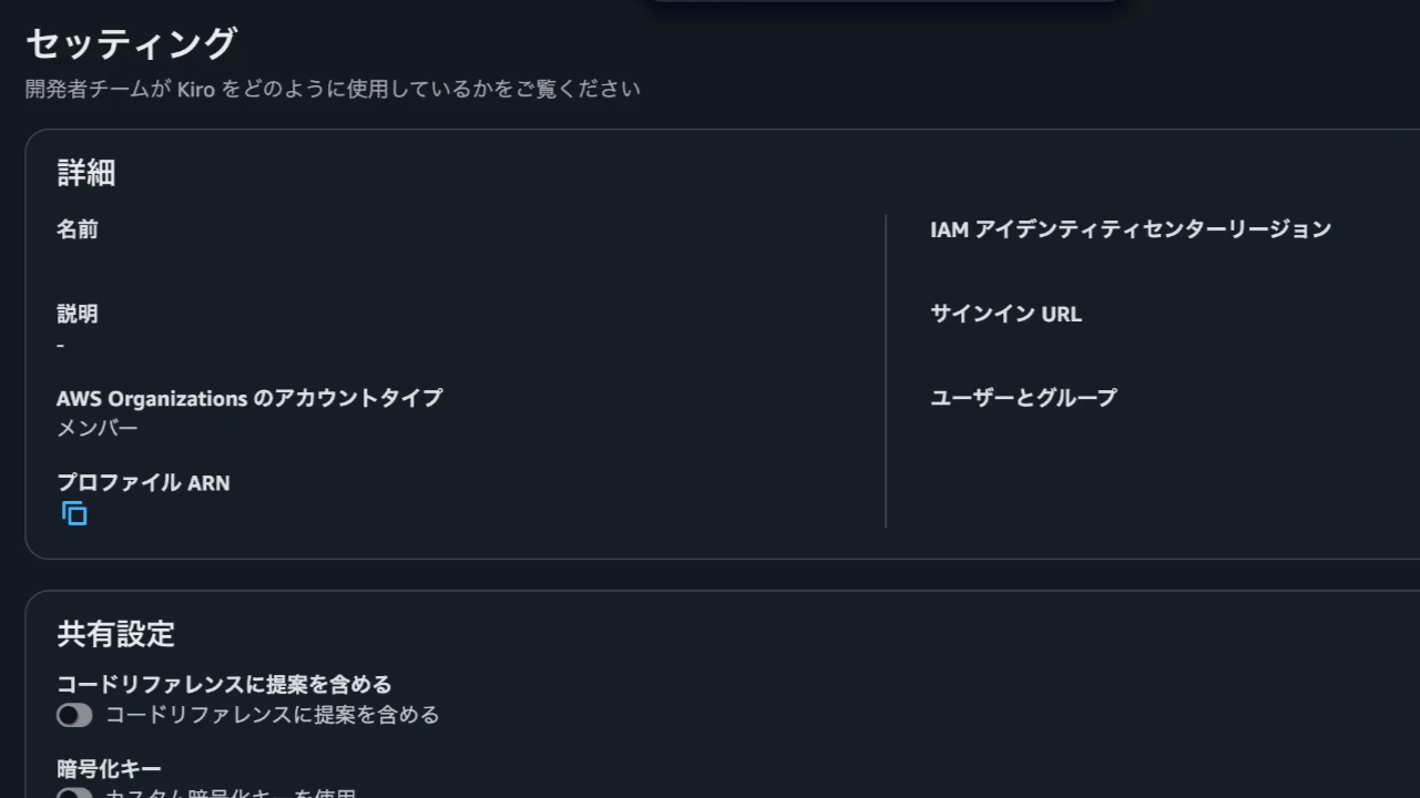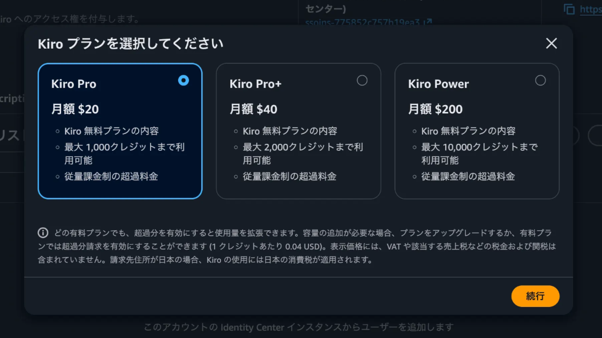 次にプランを選択し、ユーザーもしくはグループを検索し、プランを割り当てます。 なお、同一のKiroプロファイル内であれば、1ユーザーに複数のサブスクリプションが割り当てられても、最も高いTierの価格のみが請求される仕様のようです。割り当て後、Kiroのページに戻りセッティングページへ移動します。そこで表示されている「IAMアイデンティティセンターリージョン」とサインインURLを控えておきます。