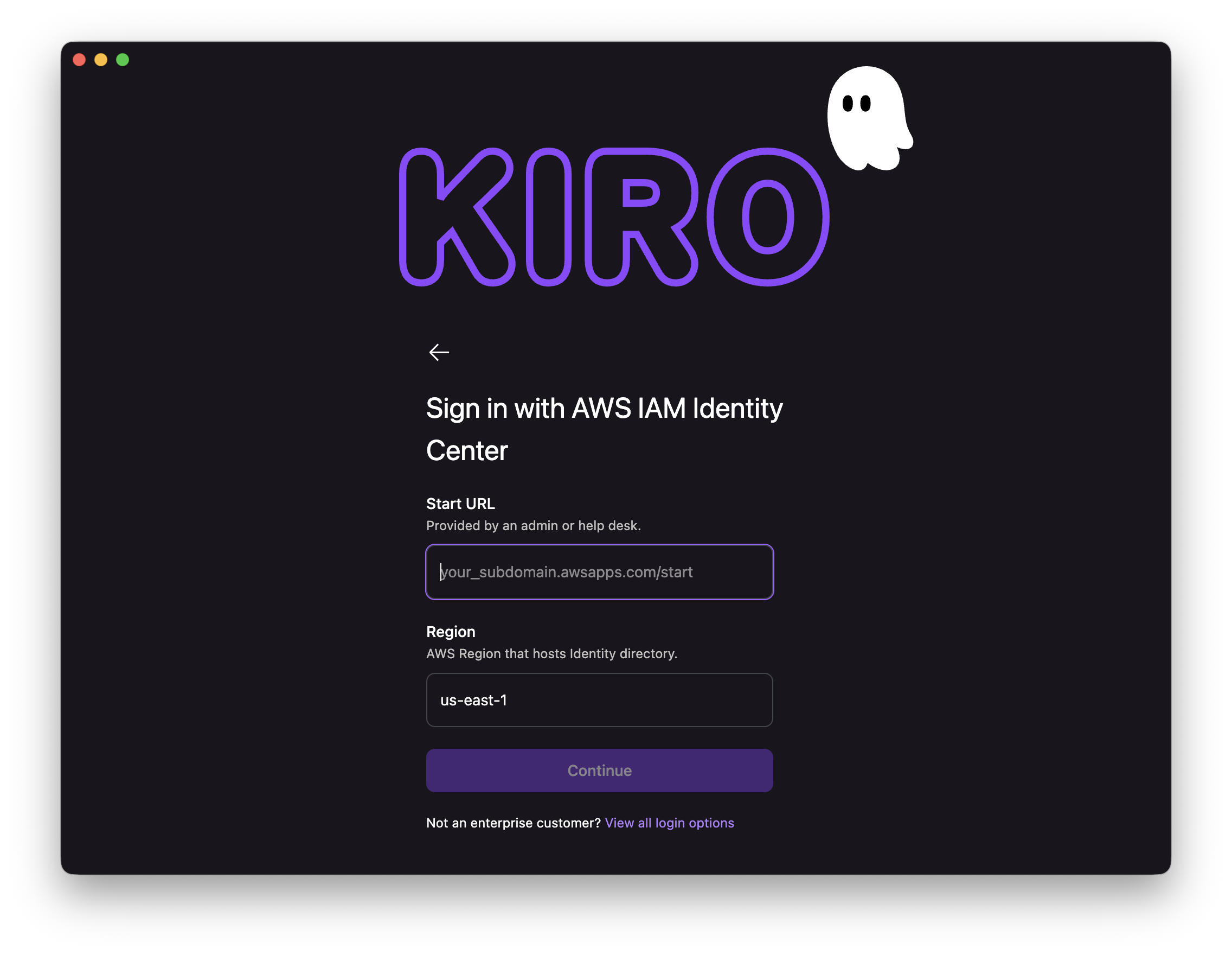 最後に「Sign in with your organization identity」をクリックし、先ほど控えたリージョンとサインインURLを入力します。また、注意点なのですがここに記載されている「Region」はKiro自体のリージョンではなく、AWS IICを有効化しているリージョンです。ここを間違えるとログインできないため注意が必要です。