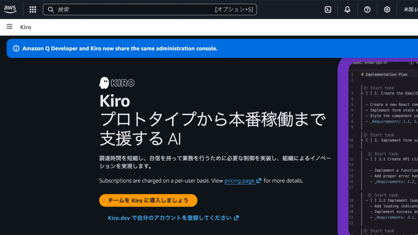 2025年11月17日、ついにKiroの一般提供が開始され、今回のアップデートでは、AWS IAM Identity Center(旧 AWS SSO、以下 AWS IIC)経由でのログインに対応したほか、コンソール上から直接プラン加入が可能になりました。本記事では、これらの新機能についてまとめていきます!
