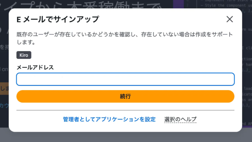 まず、コンソールからKiroにアクセスし、メールアドレスを使って管理アカウントをセットアップします。