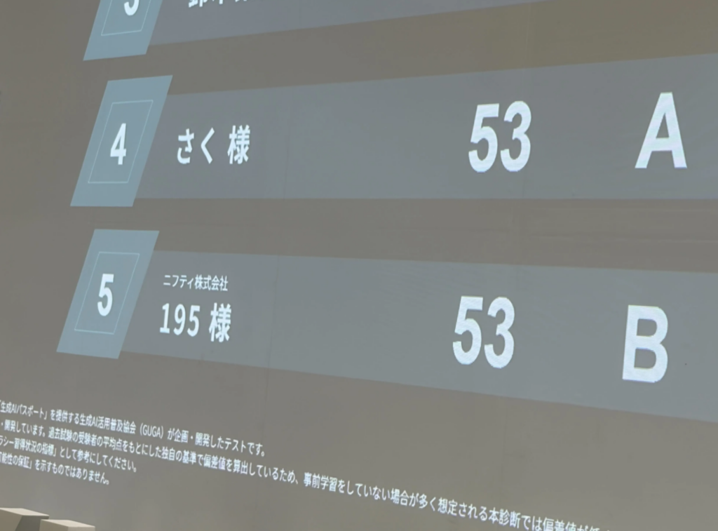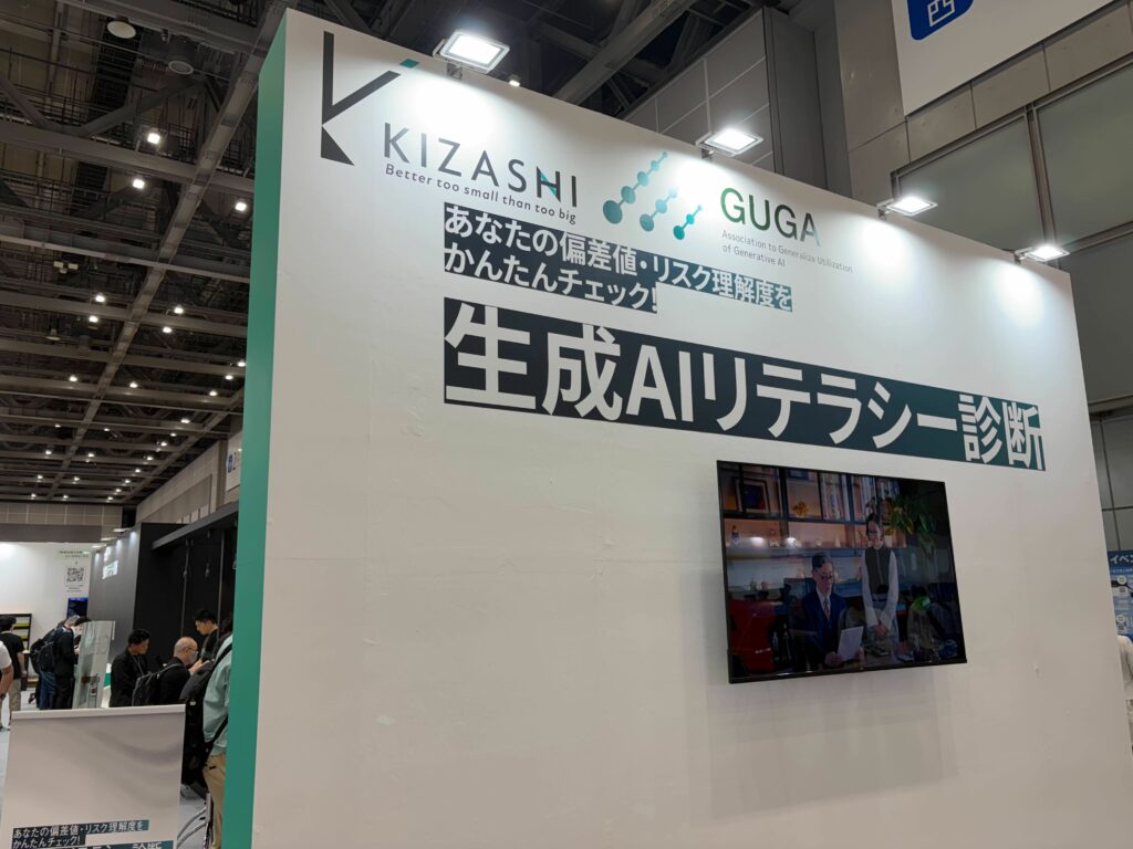 株式会社KIZASHIのブースでは、生成AIパスポート風の問題に答えながら「生成AIリテラシー診断」を体験でき、いまの理解度を手触り感をもって把握できる展示になっていました。生成AI活用普及協会(GUGA)に認定されている取り組みとのことで、学習コンテンツと診断をセットで提供している点も印象的でした。