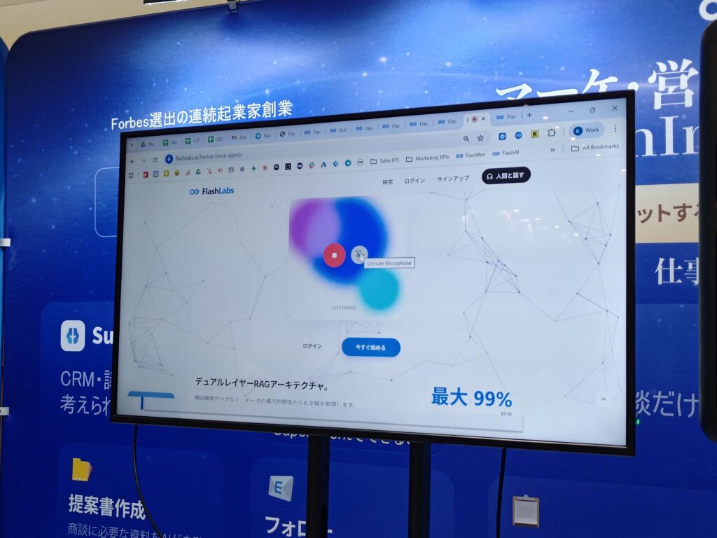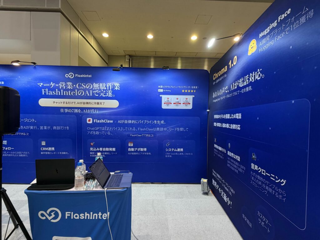 FlashIntel Japanのブースでは、CS(カスタマーサポート)業務を主戦場にした音声AIエージェントの展示が行われていました。音声モデル Chroma と FlashAI Voice Agents を軸に、営業コールや問い合わせ対応など「電話」を起点にした業務を、ナレッジベース化〜FAQ生成〜応対への反映まで一気通貫で支える構成がわかりやすかったです。